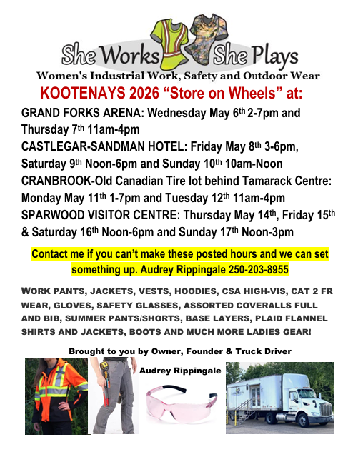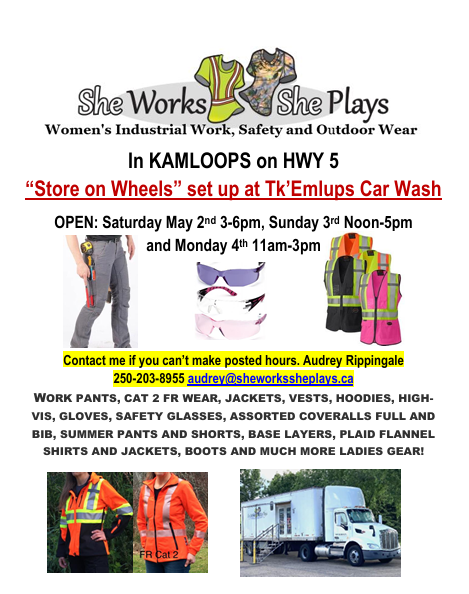 This is an exclusive personal shopping experience for women in communities across western Canada. My name is Audrey Rippingale and I am founder, owner and truck driver. for She Works She Plays. My history is driving trucks and running equipment. My own frustration at not being able to find good women's workwear that fit had me thinking it was time someone did something about this issue. So when an ongoing wrist injury prevented me from continuing to drive concrete trucks, which I had been doing for Island Ready Mix for the past decade, I realized the time to do something had come. This crossroads in life got my creativity flowing and the business was born. I truck from town to town with my Peterbillt, my pup Maggie and my converted semi-trailer which sets up as a store on wheels.